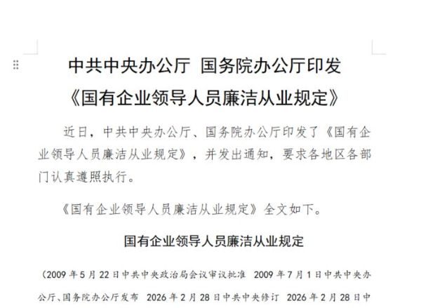 近日,中共中央办公厅、国务院办公厅印发了《国有企业领导人员廉洁从业规定》,并发出通知,要求各地区各部...