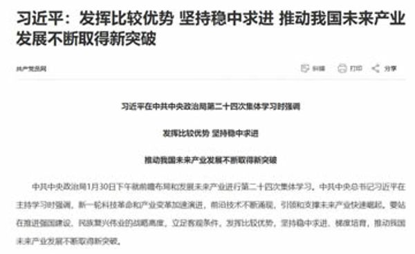 中共中央政治局1月30日下午就前瞻布局和发展未来产业进行第二十四次集体学习。中共中央总书记习近平在主...